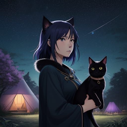 This anime art depicts a girl and her black cat camping in a backyard at night. The scene features a vibrant, deep color palette with blues and purples, and intricate details on the tent and fur, rendered in a style reminiscent of animation masterpieces.