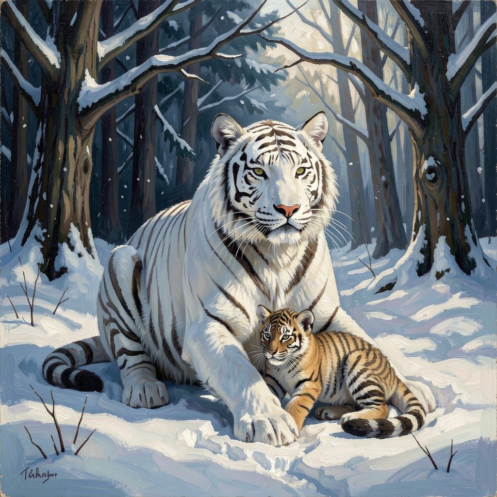 This image depicts a serene snowy forest scene with a majestic white tiger and its cub. Rendered in a rich oil painting style with visible brushstrokes, it features cool, contrasting colors.