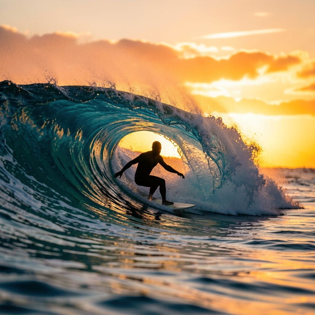 A striking image of a surfer as a dark silhouette riding a wave's translucent tunnel against a vibrant sunset. Captured with professional photography techniques and sharp focus.