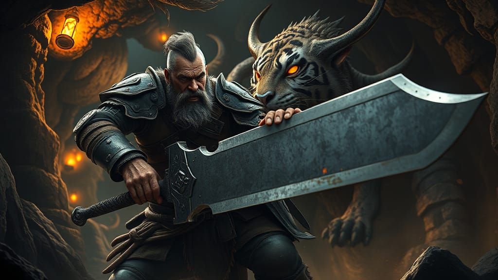 A grizzled warrior, Khazan, readies his massive sword for battle against the ferocious Shactuka, a hulking, tiger-like monstrosity, in the dimly lit Linon Mines. Inspired by cinematic lighting and anime-inspired aesthetics, this dark fantasy artwork blends gritty textures and meticulous detail.