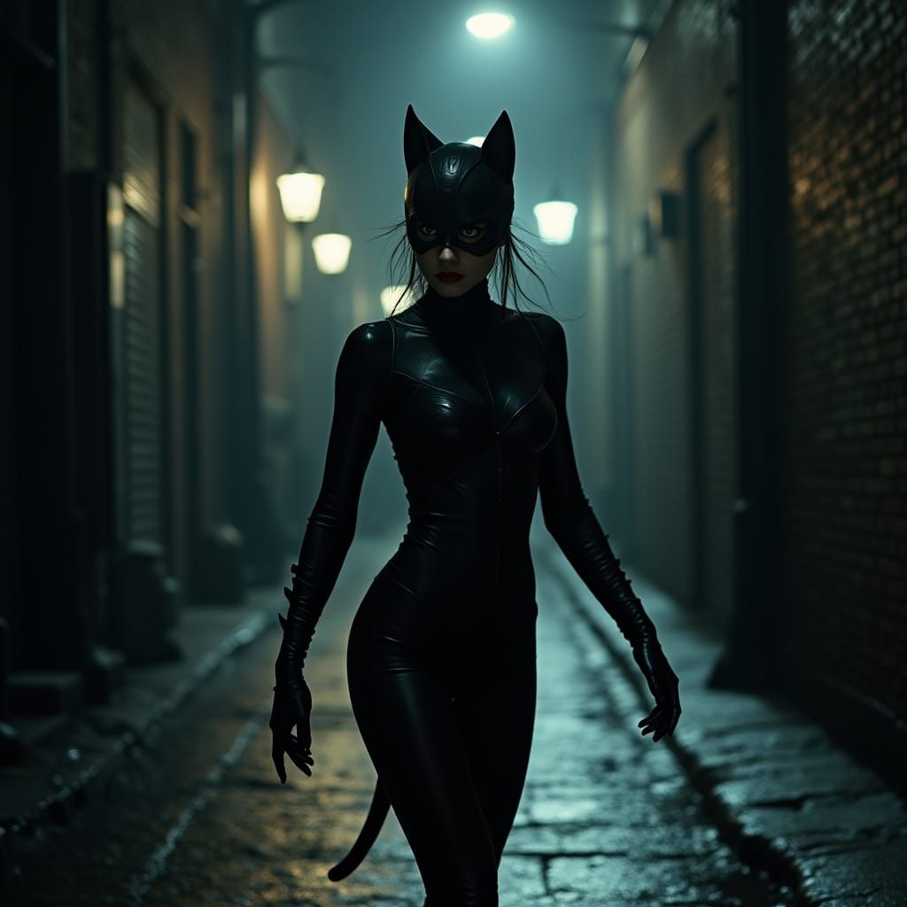 This image shows a mysterious figure, dressed in a black catsuit, navigating a dark and misty Gotham City alleyway at night. The scene is illuminated by flickering streetlights, casting ominous shadows in a style reminiscent of classic noir.