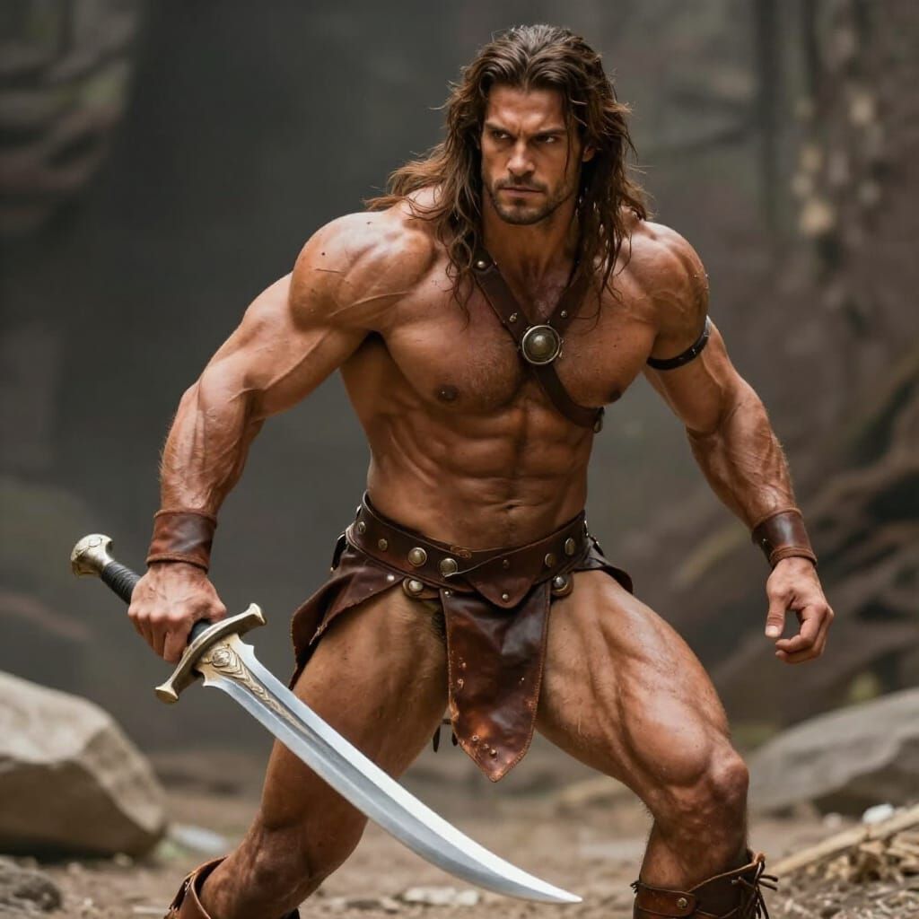 This image depicts a classically handsome, highly muscular warrior inspired by the BeastMaster series. He has tanned skin, long brown hair, and wears simple leather gear, wielding a curved sword.