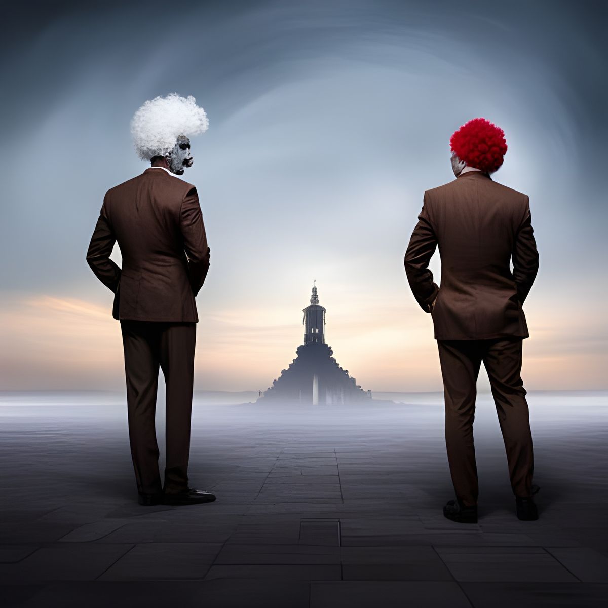A surreal image of one dead clown contrasted with two live clowns. The composition and style evoke dreamlike imagery, reminiscent of surrealist painting.
