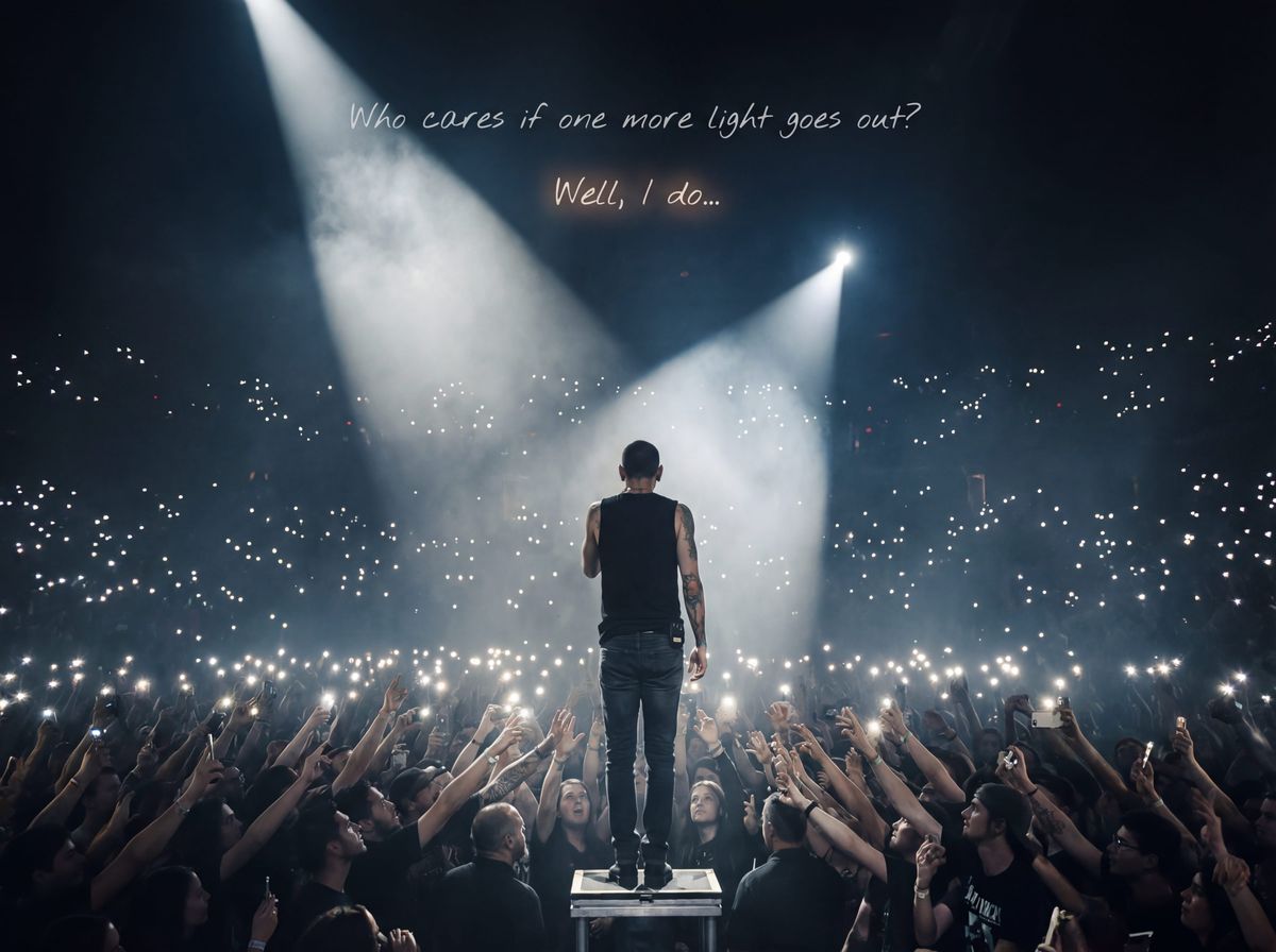 This image depicts a dramatic, wide-shot concert scene featuring Chester Bennington. He stands illuminated by a single spotlight amidst a vast crowd, conveying a sense of introspection and emotional weight.