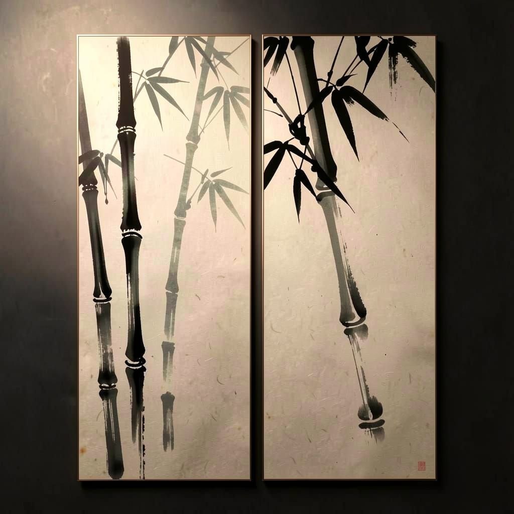 This image features two mirrored minimalist paintings of bamboo stalks. Created with bold black ink brushstrokes on rice paper, it evokes a serene atmosphere.