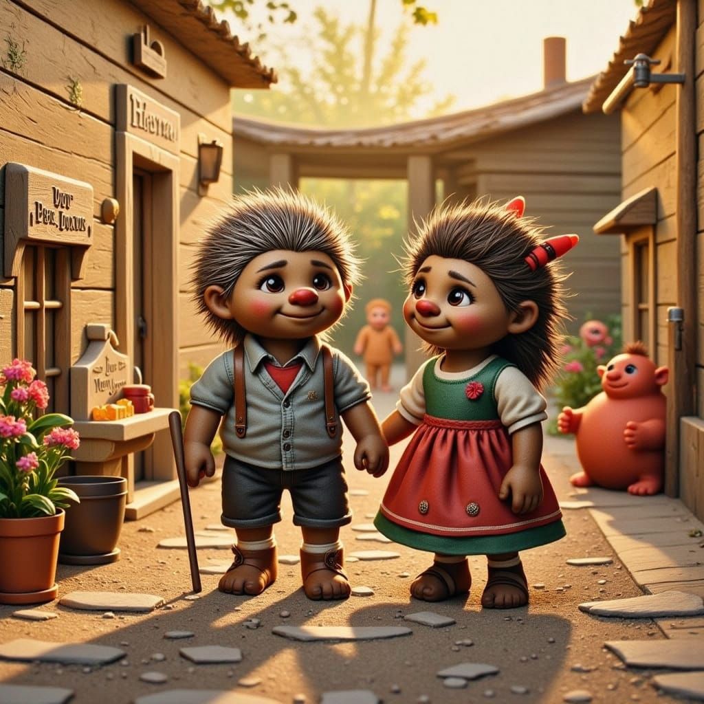 This image shows two hedgehog dolls with human faces, dressed for summer, exploring a jungle. It has a handcrafted doll film aesthetic, reminiscent of stop-motion animation with a nostalgic, warm feel.