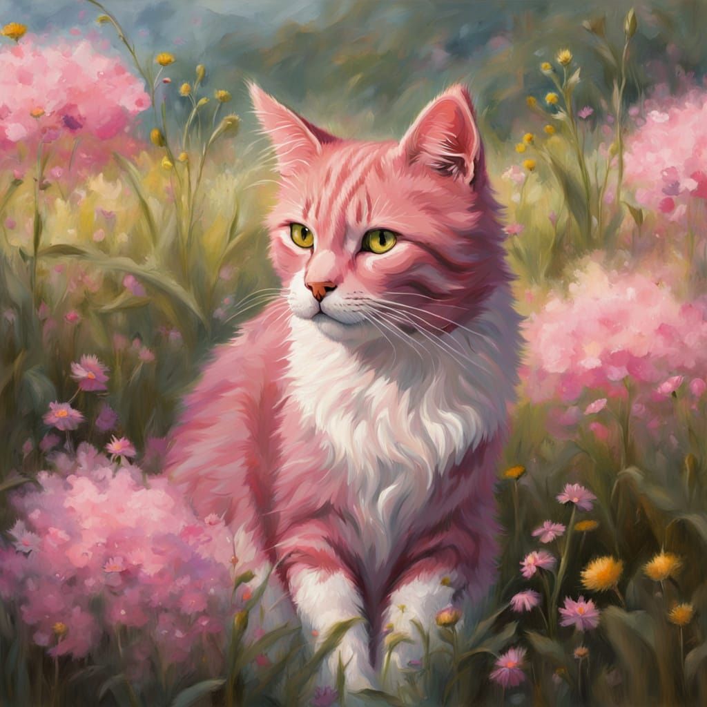 This image shows a whimsical pink cat resting in a field of wildflowers. Rendered with detailed fur texture and painterly brushstrokes in soft natural light.