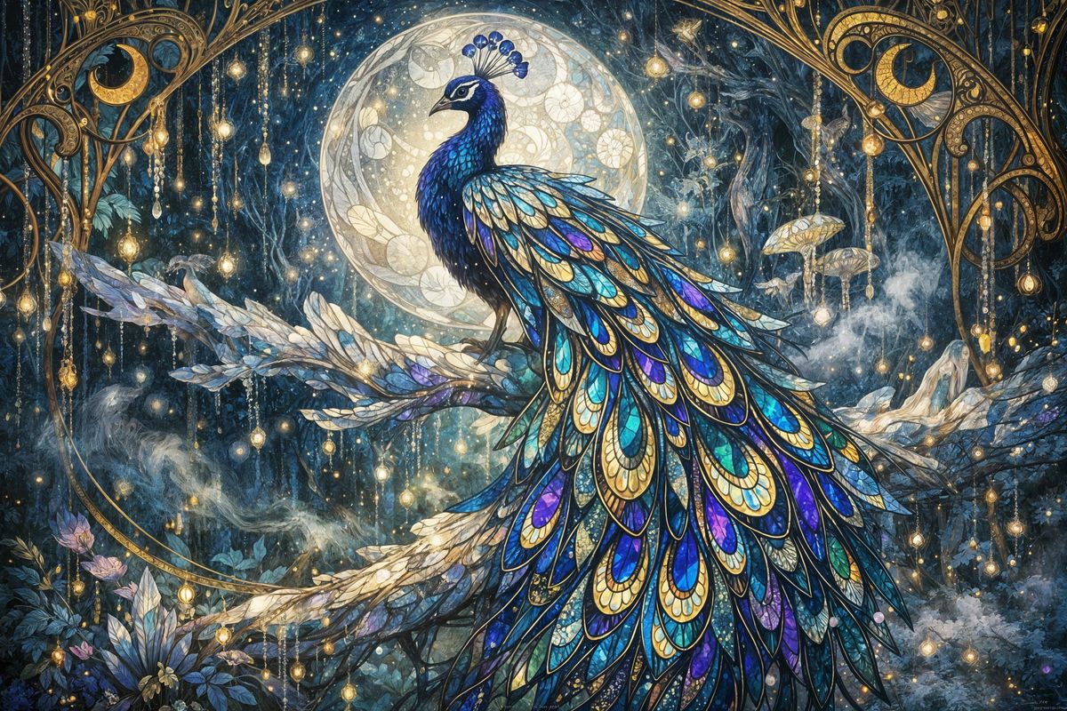 A mystical peacock with stained glass feathers rests on a crystal branch in a glowing forest. Ethereal mist and spores fill the air, creating a vibrant, magical scene.