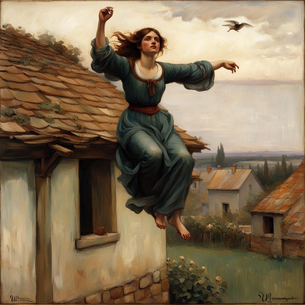 A painting of a peasant girl on a farmhouse roof, arms spread as if taking flight. This striking picture captures a pre-Raphaelite aesthetic, reminiscent of classical themes.