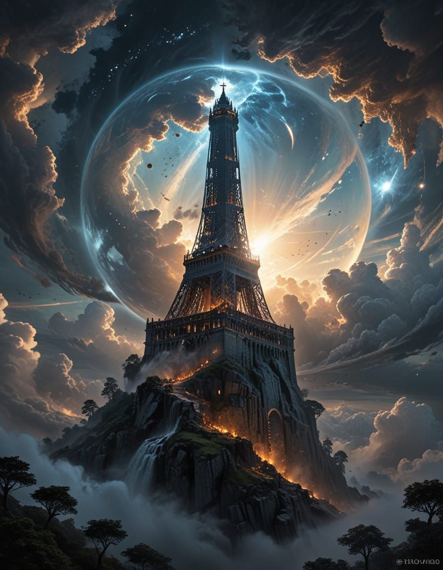 The liquid sphere pulses with captured cosmos. Below, the world drowns in clouds. Above, silence.