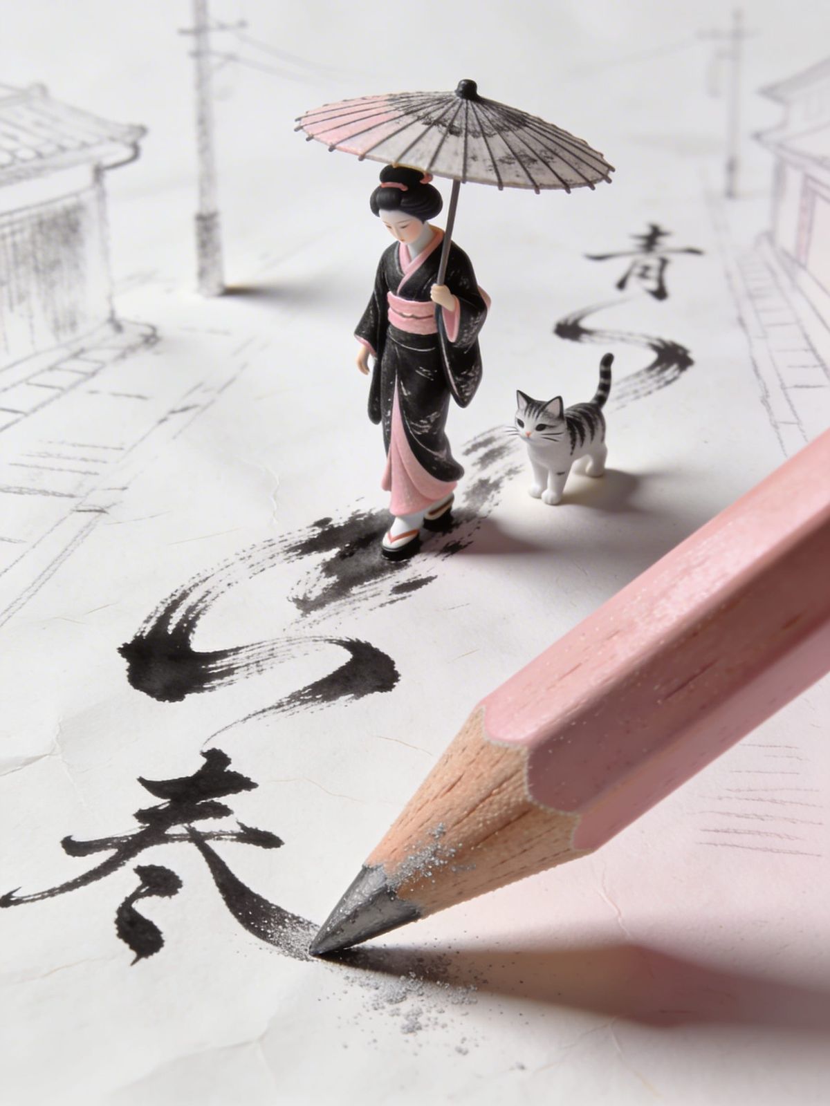 This surreal macro image blends drawing and miniature 3D reality. A giant pink pencil interacts with a drawing, bringing a tiny geisha to life from sketched lines.