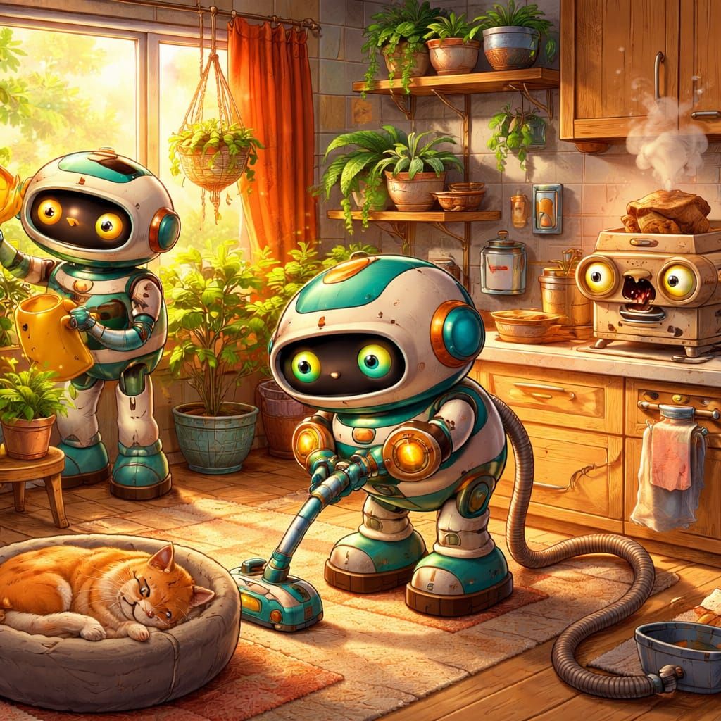 This image shows humorous, detailed robots performing household tasks in a warm, retro-futuristic apartment. A lively composition captures whimsical yet believable scenes.
