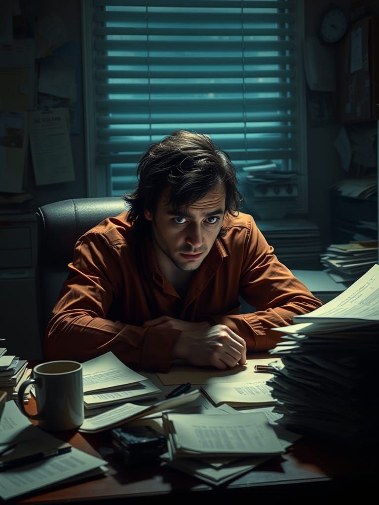 This image depicts an utterly hungover individual struggling to function at a cluttered, dimly lit office desk. Dramatic lighting emphasizes extreme exhaustion and disarray, rendered in a maximalist digital matte painting style.