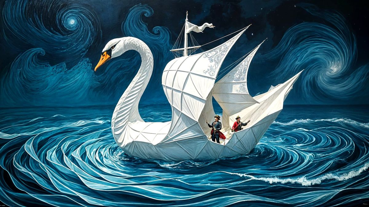 A magical origami swan ship with pirate crew sails a cosmic sea. Features intricate paper folding, silver filigree sails, and glowing bioluminescent details in an impressionistic oil painting style.