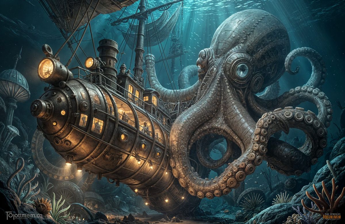 This image shows a detailed steampunk submarine attacked by a colossal octopus in the ocean depths. It features dramatic lighting and vibrant colors, evoking Victorian scientific illustrations.