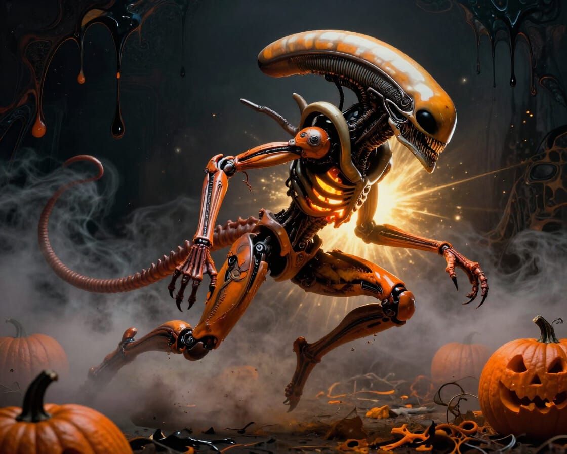 A striking image of a Xenomorph-hybrid in a high-speed gallop, captured in a cinematic pumpkin patch. Features a blend of biomechanical and organic textures, with dramatic lighting and a high-fashion color grade.