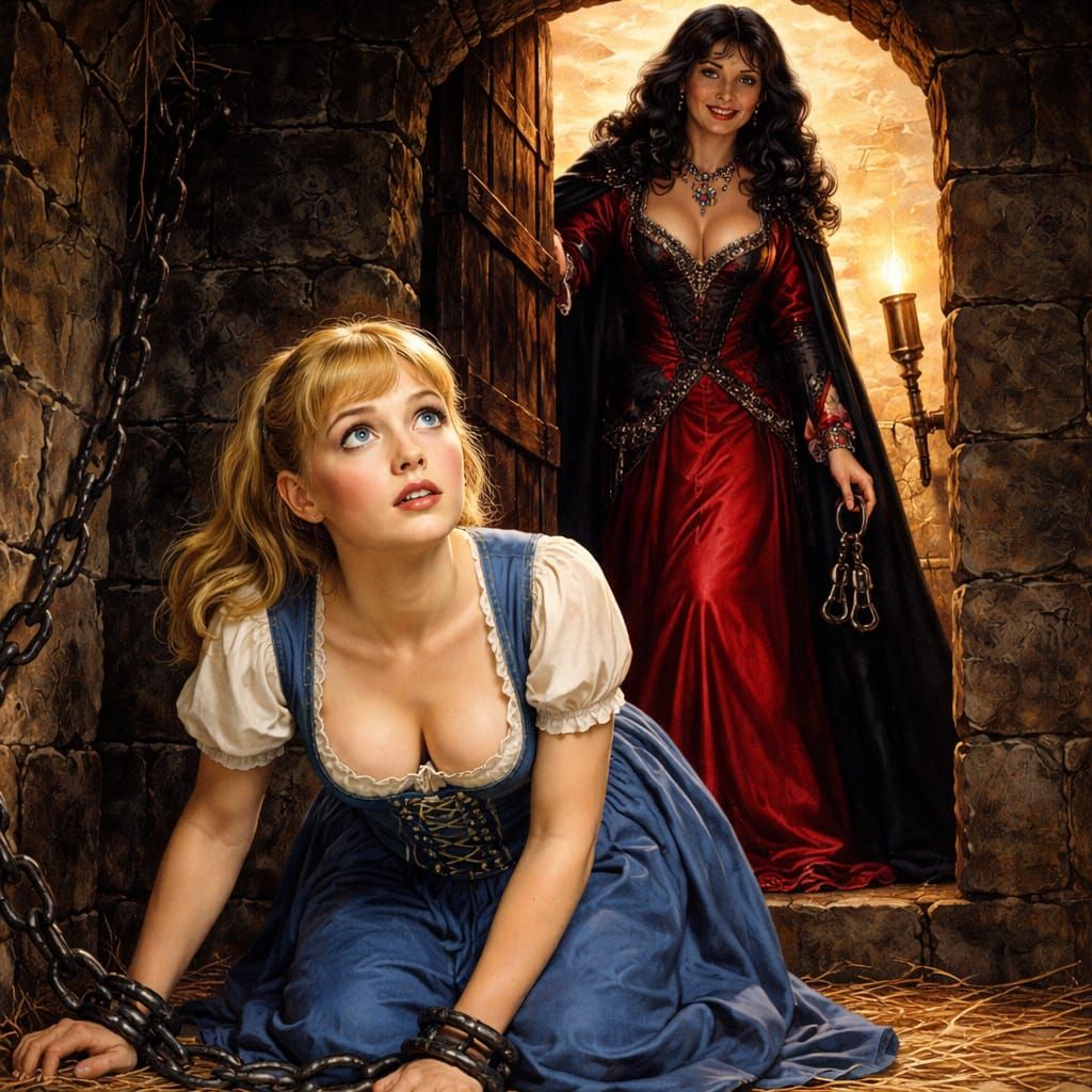 This illustration shows a blonde woman in a blue dirndl on her knees in a dungeon, looking up in despair. A dark-haired woman in a red gown smiles maliciously from the doorway.