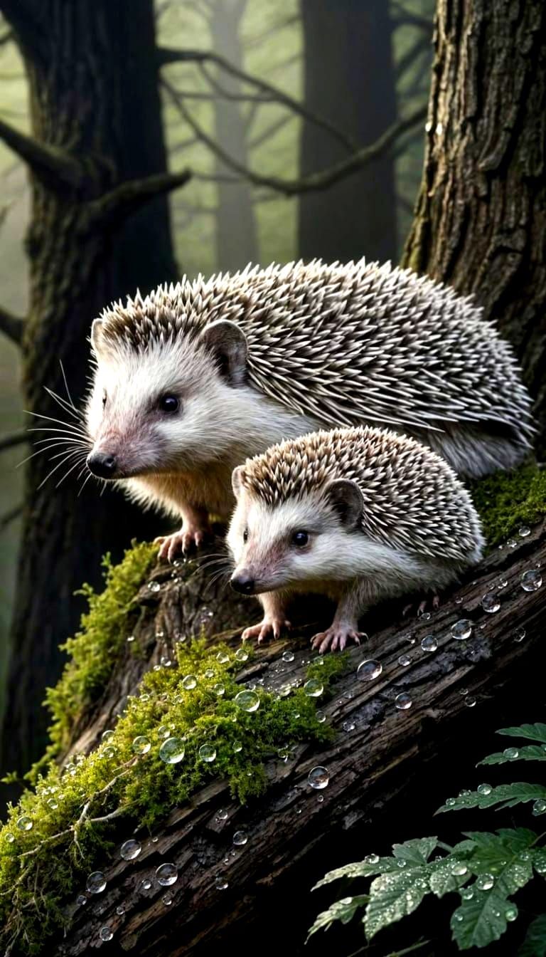 Hyper-realistic pencil art. A majestic northern white breasted hedgehogs rendured with extreme detail, stands in a serene, sacred grove. Super dramatic chiaroscuro lighting emphasizes its powerful form against a backdrop of ancient trees and soft mist. Masterpiece, best quality, intricate details.