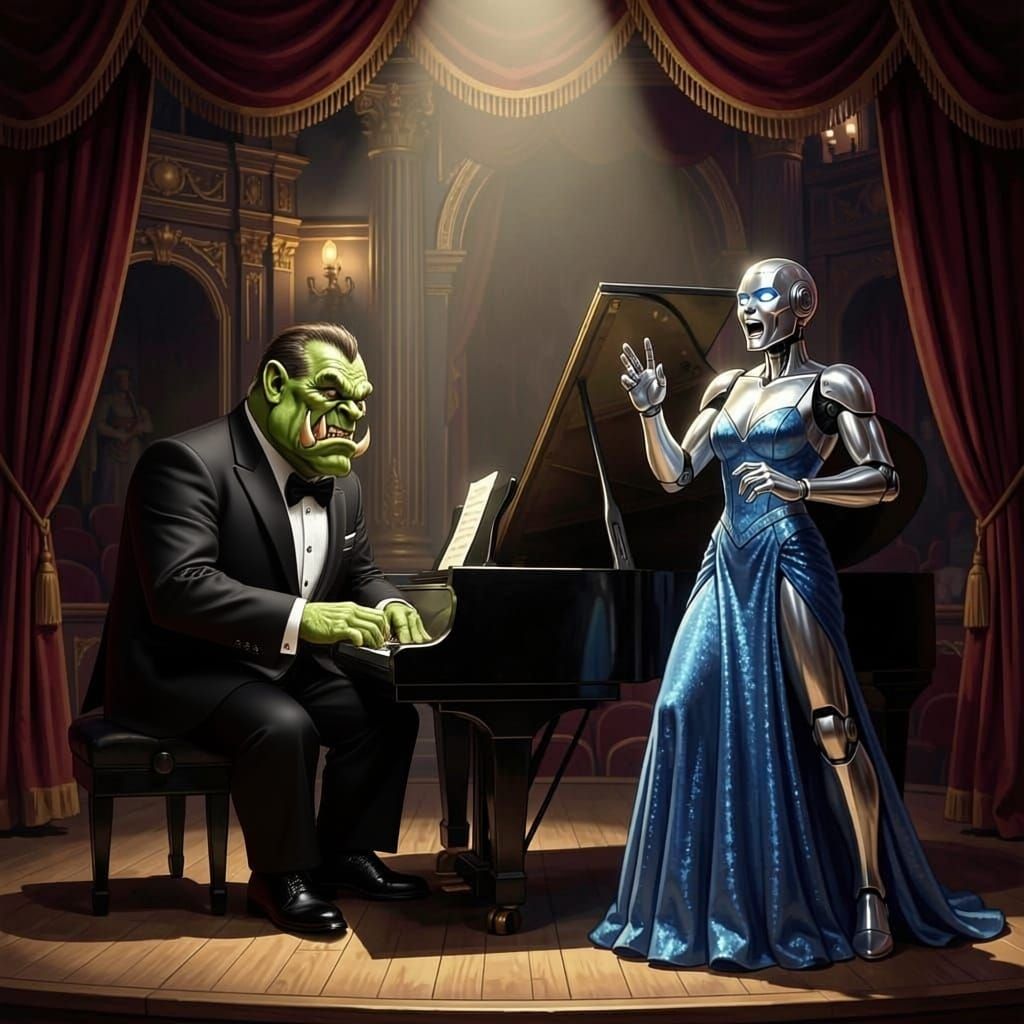 This image depicts an ogre playing a grand piano and a robot in a gown singing. Set in an opulent concert hall with dramatic lighting, it resembles fantasy concept art.