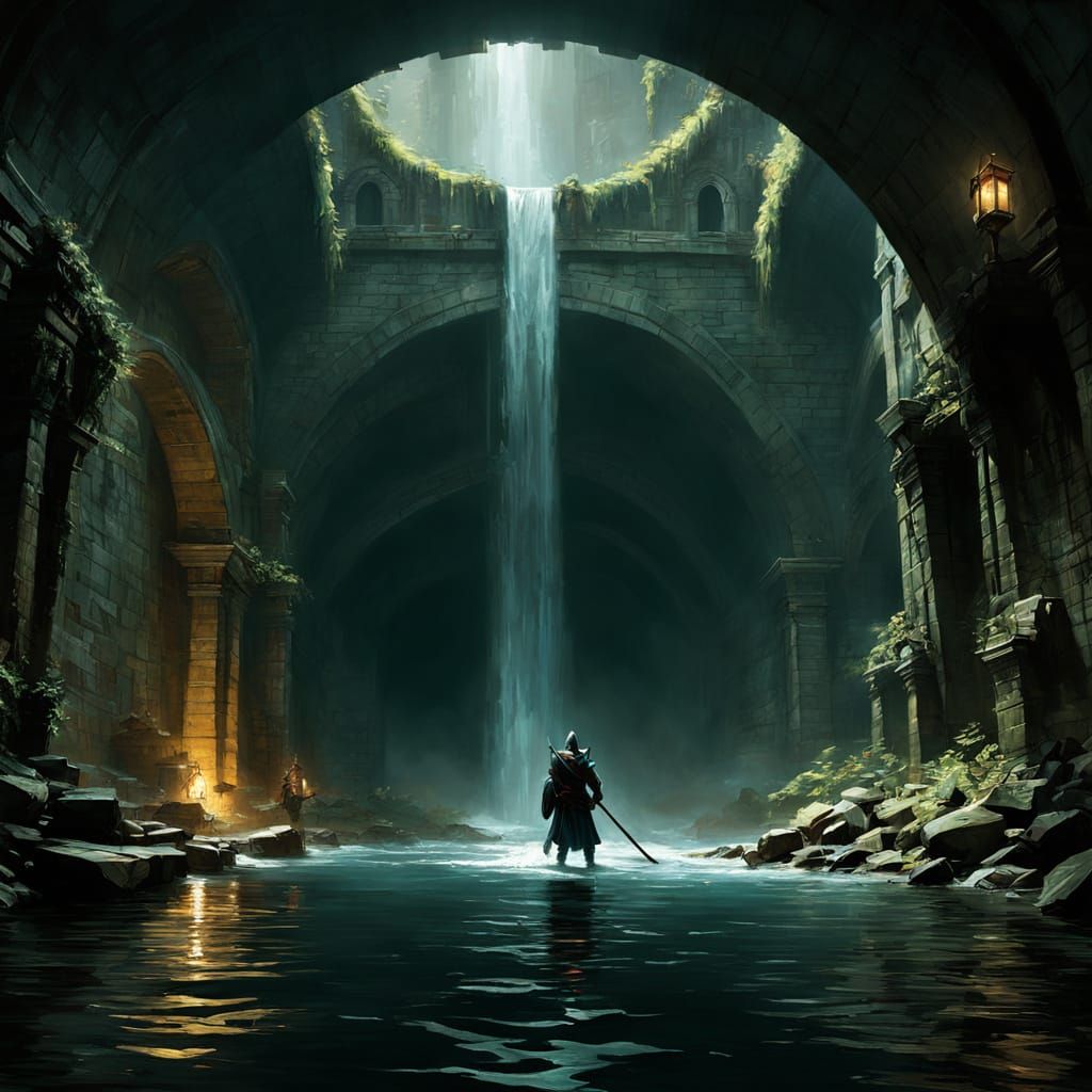 This image depicts paladins and wizards in a dimly lit, flooded tunnel, rendered with dramatic chiaroscuro lighting and intricate detail, reminiscent of classical romanticism.
