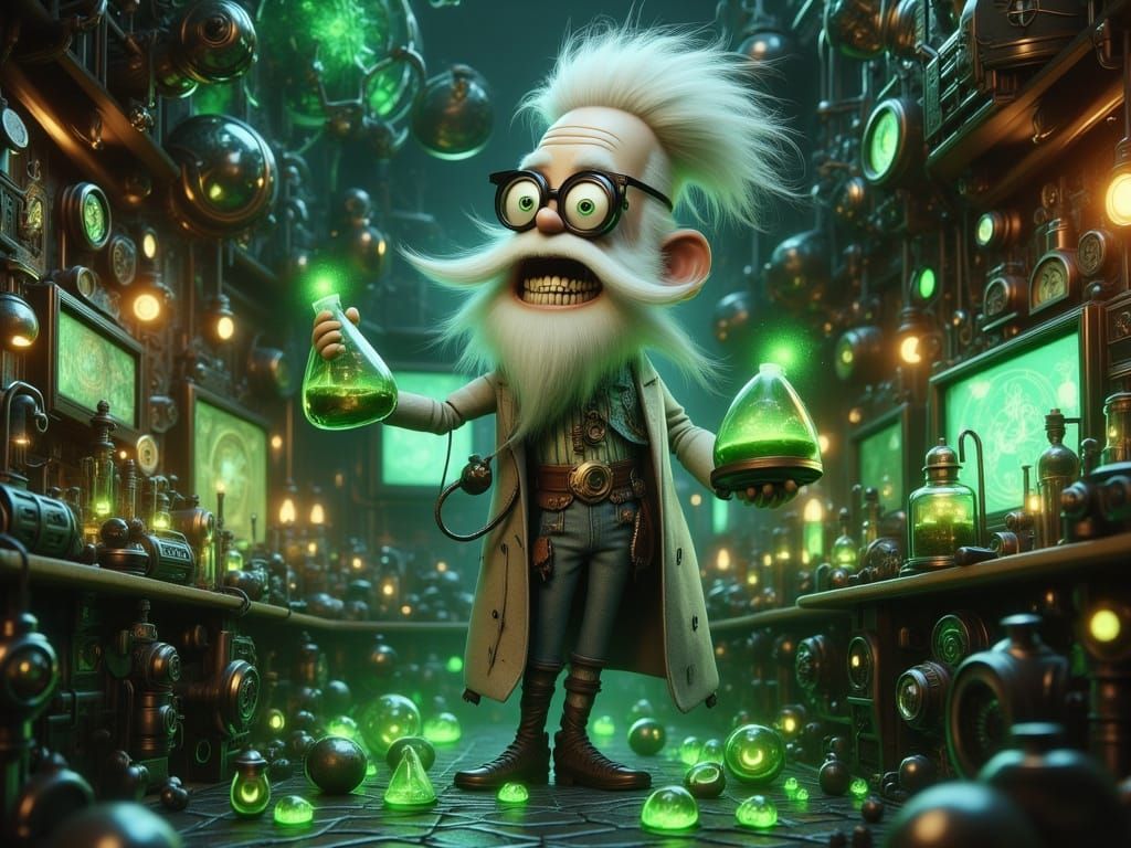 This photorealistic image shows a tall, skinny 3D cartoon mad scientist with wild hair and a maniacal grin, holding a glowing green bubbling beaker in a cluttered laboratory. Features cinematic lighting and high detail.