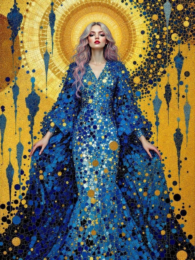 This image features a full-body view of a blond woman with pink-tipped hair, rendered in a style combining gold-saturated fragmentation, gestural mark-making, and Byzantine mosaic influences. The art features fractured brushwork and vibrant color saturation.