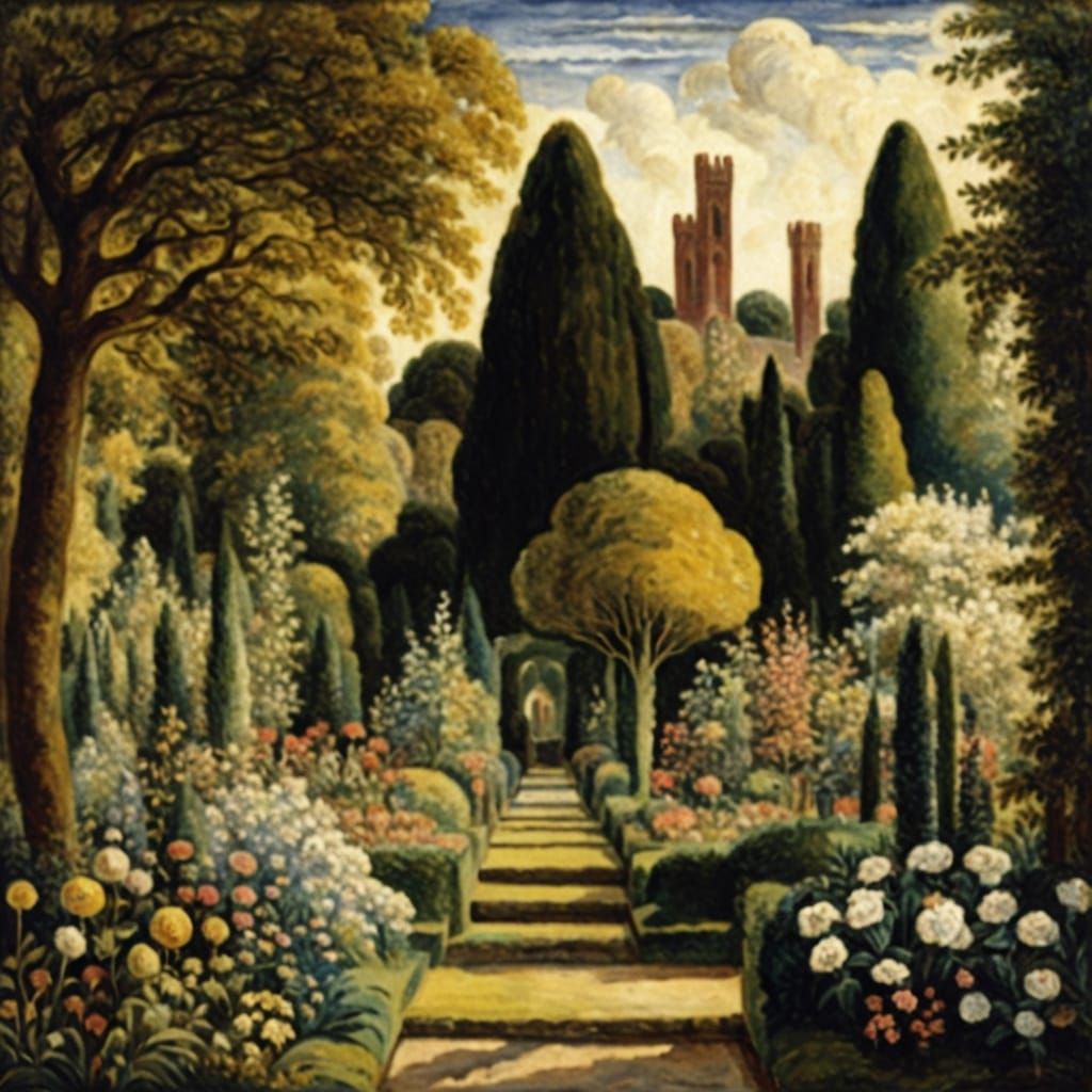 This image depicts a formal garden, rendered in the distinctive artistic style of Samuel Palmer, evoking a sense of pastoral beauty and dreamlike atmosphere.