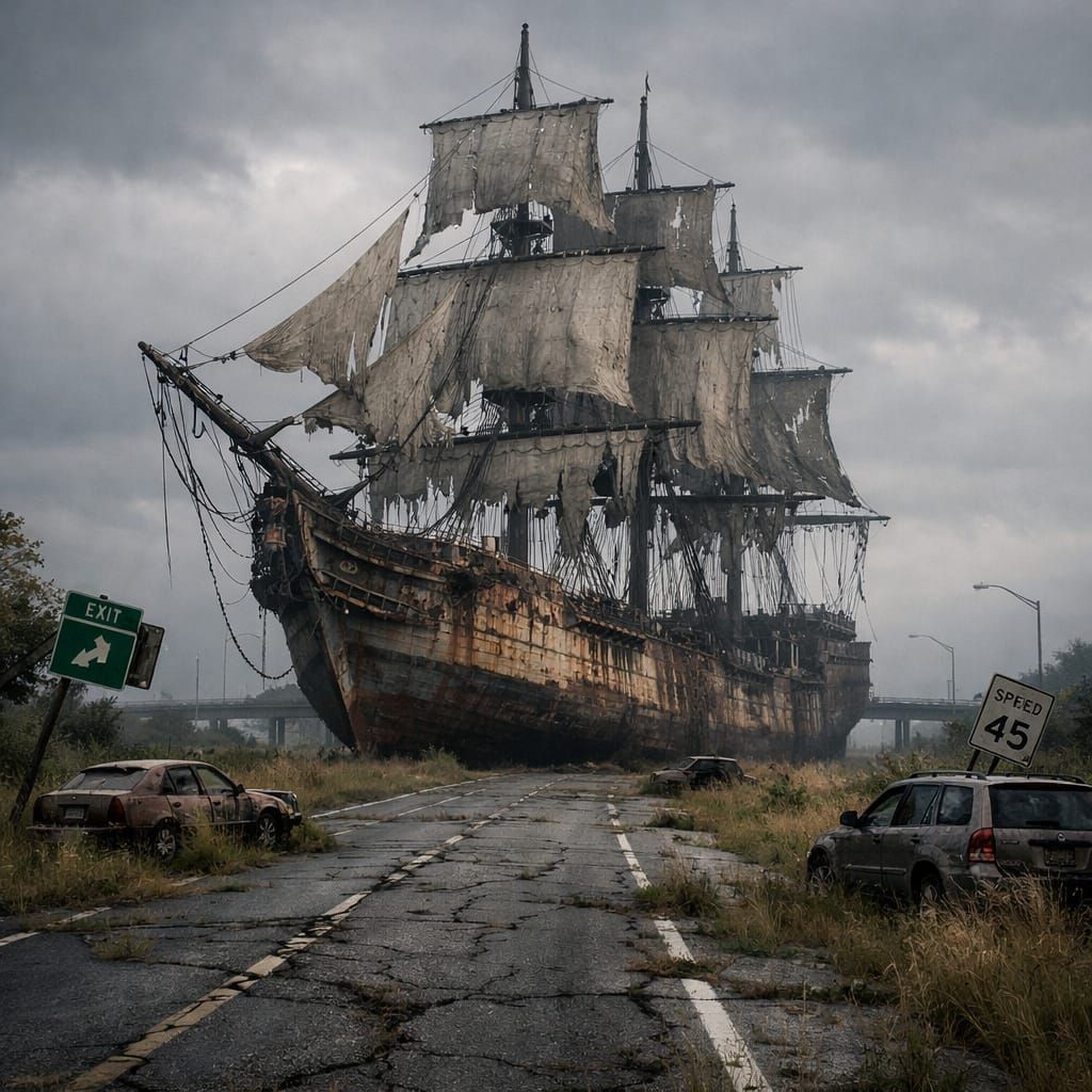 This photorealistic image depicts a massive, weathered sailing ship stranded on a cracked, overgrown abandoned highway. Moody lighting and dramatic scale create an atmospheric, cinematic scene.