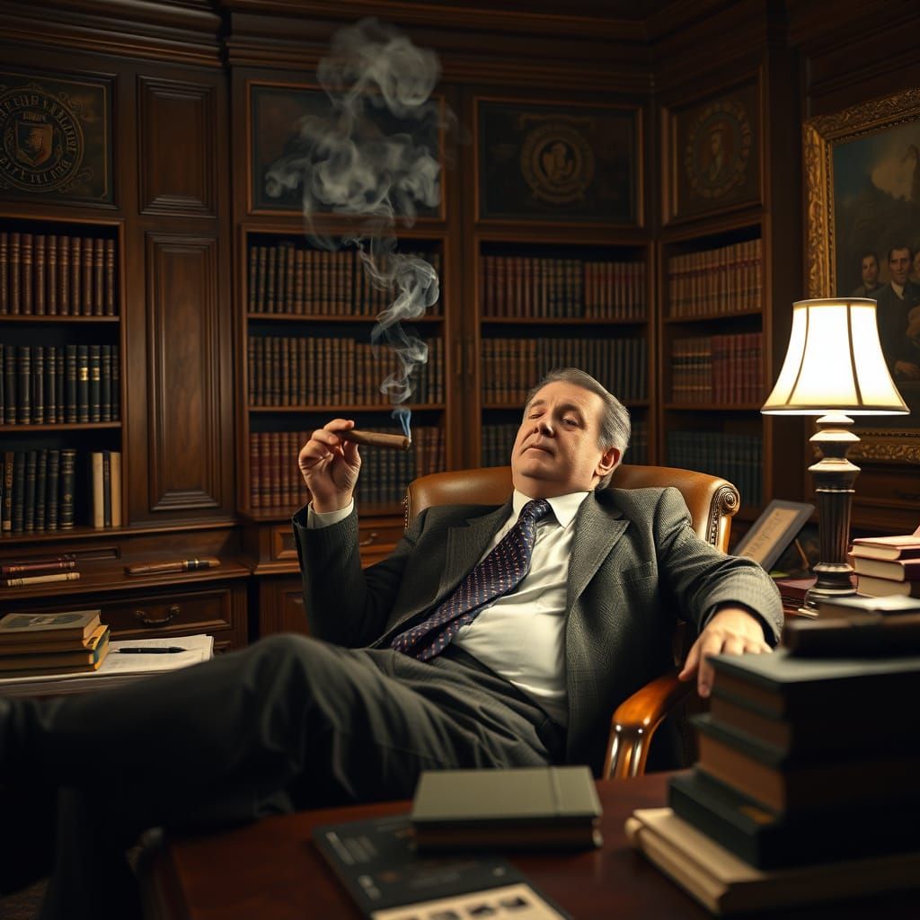 A vintage image of a man relaxing in a luxurious, old wooden office, surrounded by the scent of cigars, wood, and old books, with a Cuban cigar in hand and smoke filling the air.