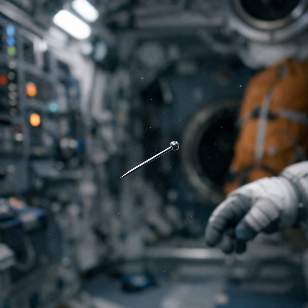 This AI image captures the unsettling quiet of zero gravity, where a floating pin highlights the absence of sound and the strangeness of physics.