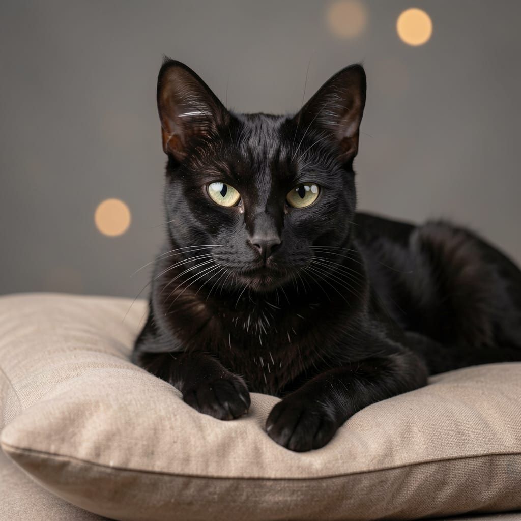 This image features a professional studio portrait of a sleek black cat with striking greenish-yellow eyes resting on a pillow. The photograph utilizes soft bokeh and studio lighting for a sharp, high-resolution look.