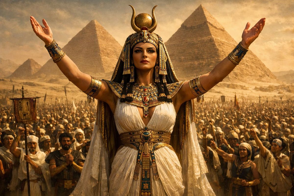 This image shows an antique Egyptian queen with a commanding presence, arms raised before a vast crowd, with pyramids and sand dunes in the background. Masterpiece quality.