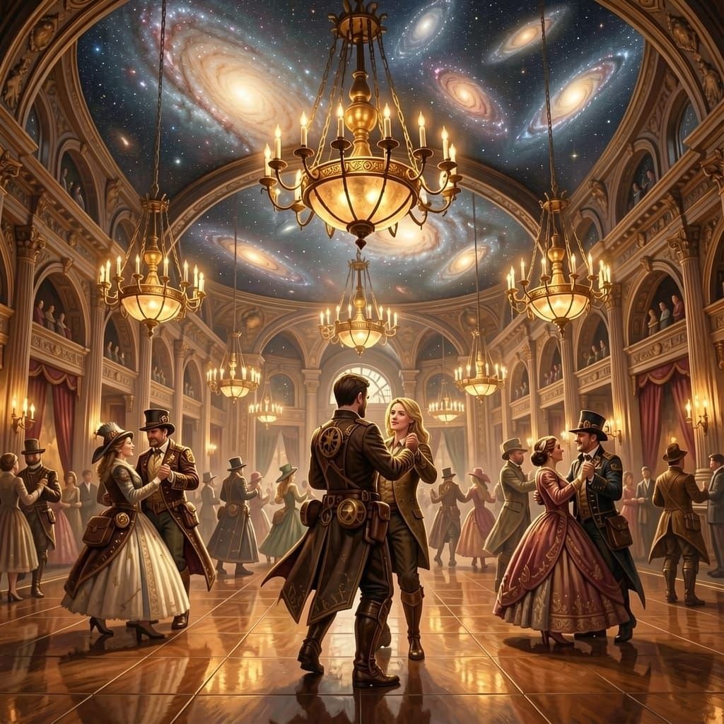 This image shows elegantly dressed figures dancing in a grand ballroom filled with cosmic wonders and Victorian-futuristic architecture, illuminated by ornate chandeliers.