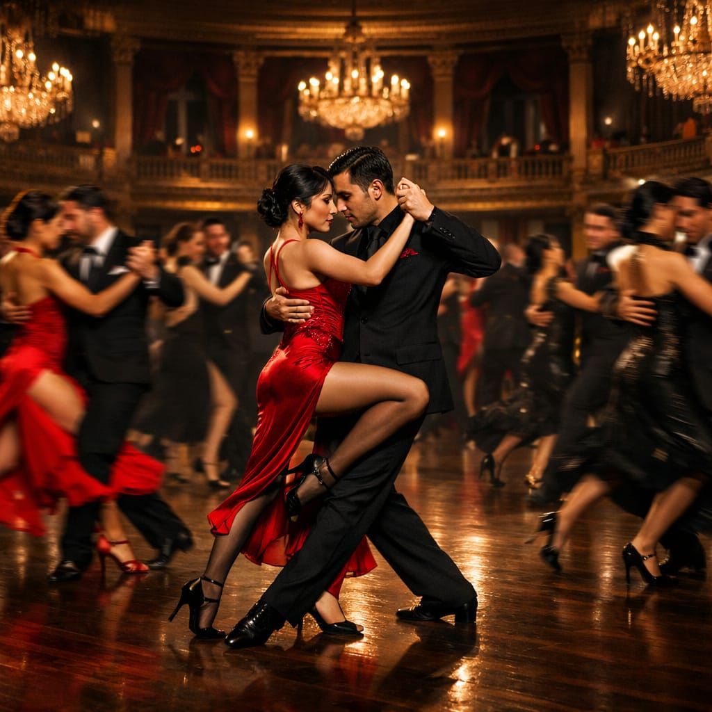 A cinematic scene of couples dancing Argentine tango in a grand ballroom. A central couple in crimson and black stands out in an elegant, interwoven pose, radiating raw emotion.
