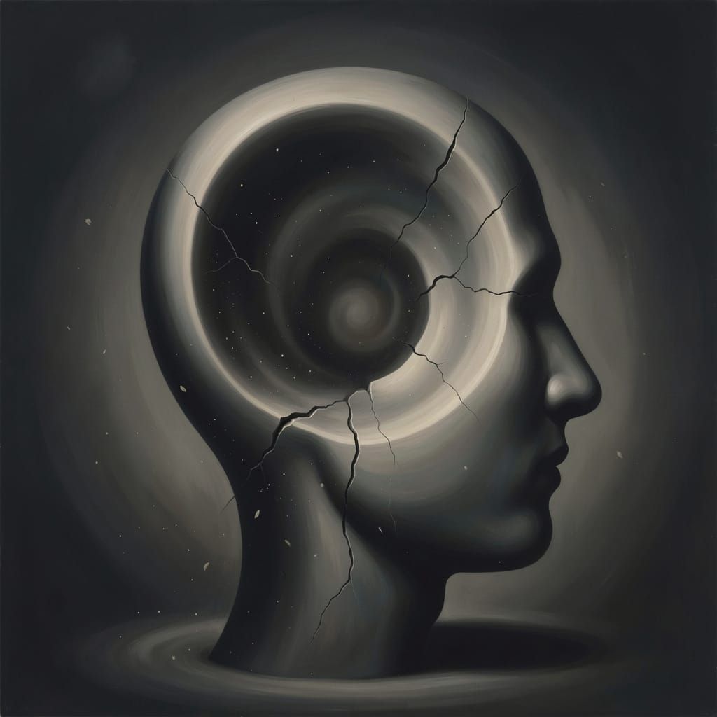This surreal artwork depicts a human head silhouette with a hollow interior filled with swirling shadows and faint cracks. Low-key lighting enhances a moody, abstract atmosphere, evoking feelings of emptiness and pressure in a desaturated style.