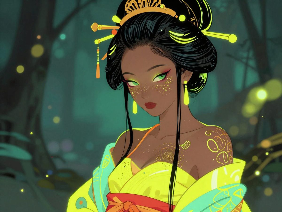 This image features a geisha in a fantasy illustration style, blending Japanese woodblock prints with vibrant African art. Bioluminescent freckles and neon accents add a glowing, dramatic effect.