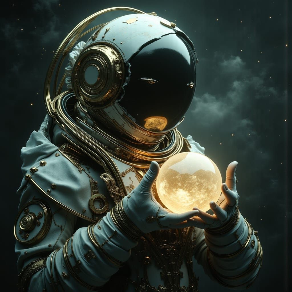 This image depicts an astronaut in a highly detailed spacesuit, rendered in a surreal, dreamlike style with exaggerated 3D depth and dramatic lighting. The scene features realistic textures and intricate suit details, illuminated by soft, glowing light.