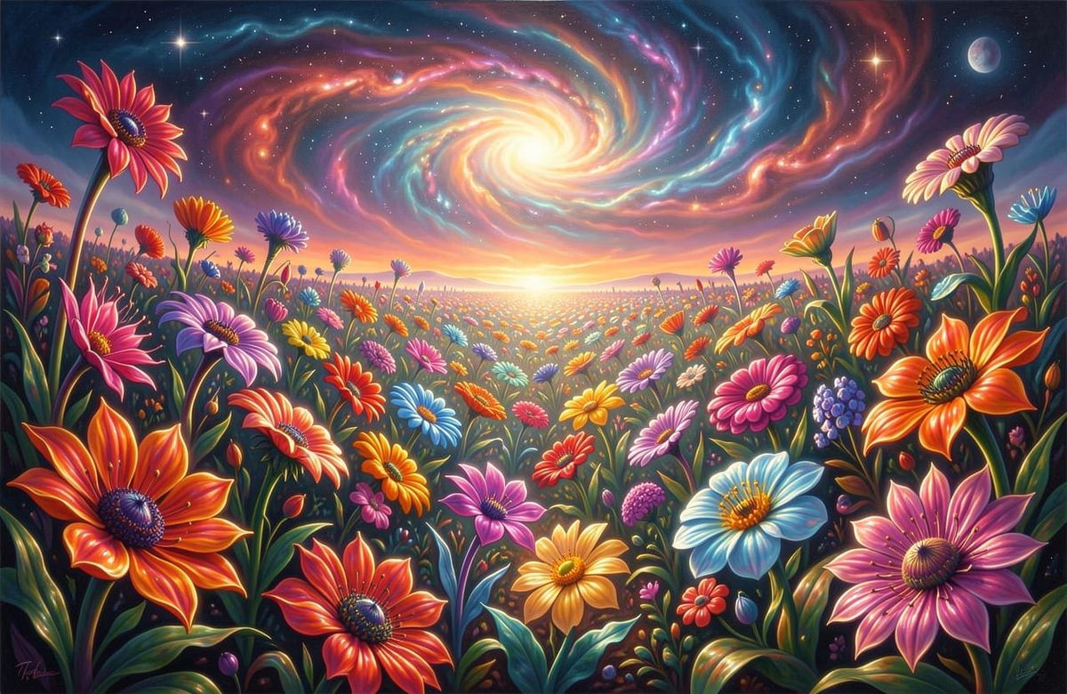 This image showcases a surreal, dreamlike cosmic garden filled with vibrant, alien flowers under a swirling nebula. Dynamic lighting creates glowing edges and fantastical shadows.