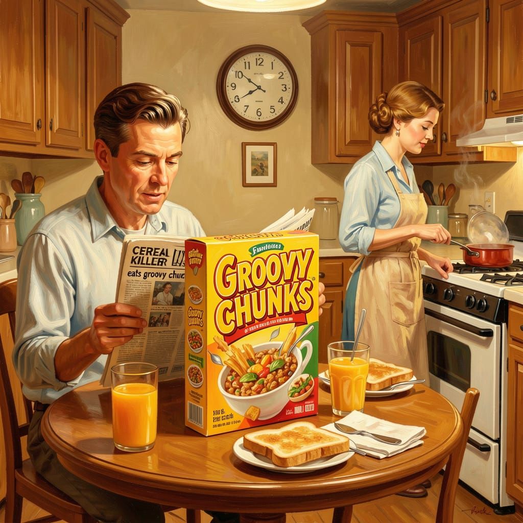 This image depicts a 1950s-style oil painting of a "Groovy Chunks" cereal box on a breakfast table, evoking mid-century American domestic life with warm lighting and a nostalgic palette.