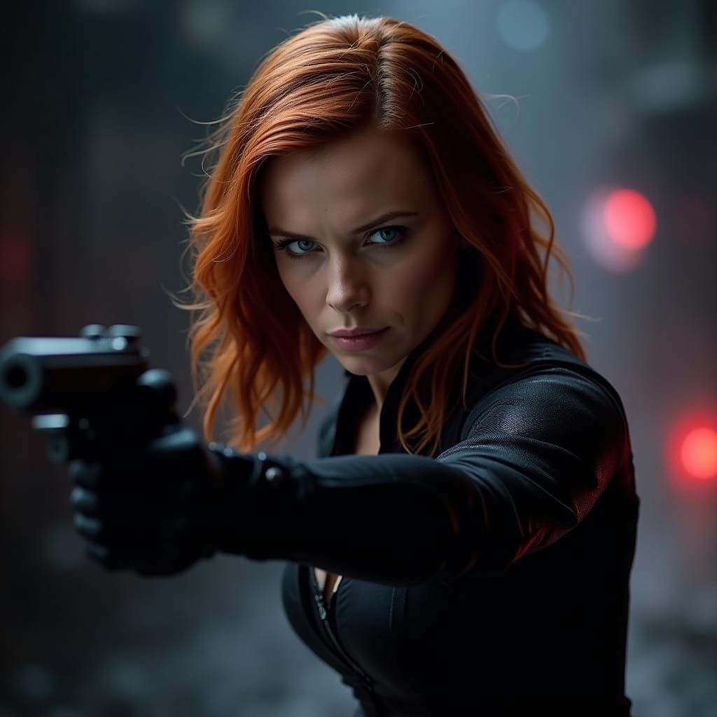 This image depicts Amy Adams as Black Widow in a dynamic action scene, featuring striking blue eyes and auburn hair. Cinematic lighting and a futuristic cityscape create a dramatic atmosphere.