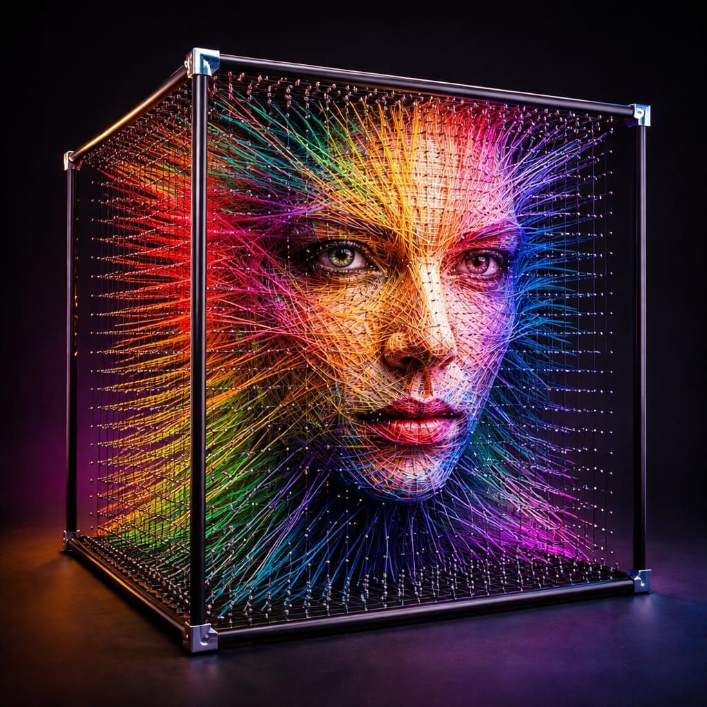 A striking portrait created with rubber bands stretched between nails in a 3D frame, set against a chromonoir background. This unique artwork showcases incredible detail and perspective.