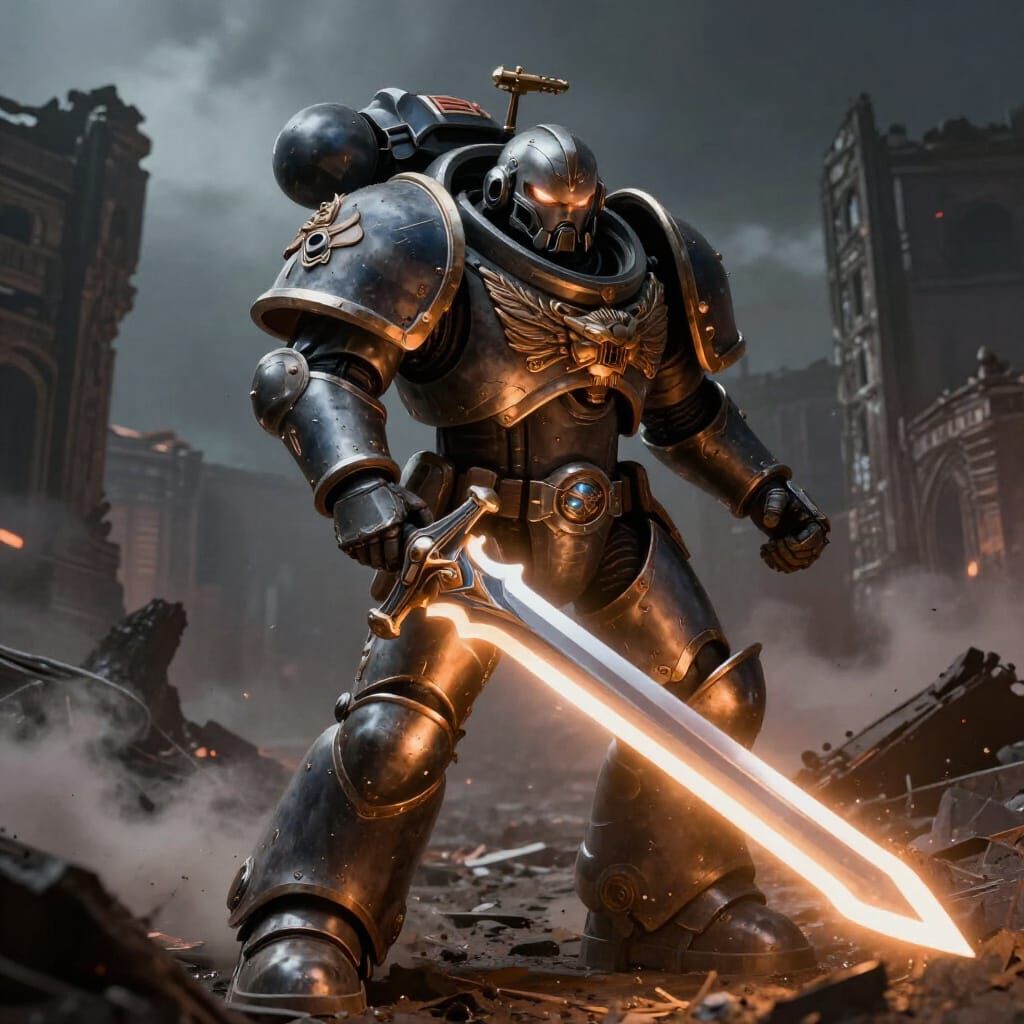 This image shows a Warhammer 40k Space Marine in detailed armor, holding a radiant energy sword. Set in a war-torn city with dramatic lighting, it captures a grimdark aesthetic through realistic digital painting.