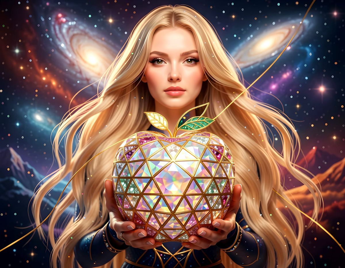 This image features a Faberge-style apple, intricately inlaid with precious stones and gold. It displays a diamond pattern with fine lines and geometric abstraction, rendered with a luminous, cosmic aesthetic.
