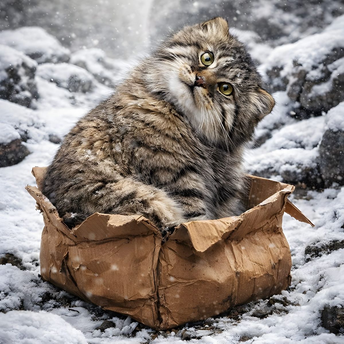 This image shows a majestic Pallas cat crammed into a bulging, crumpled cardboard box. The cat looks confused as it sits among snow-covered rocks in a highly detailed, maximalist style.