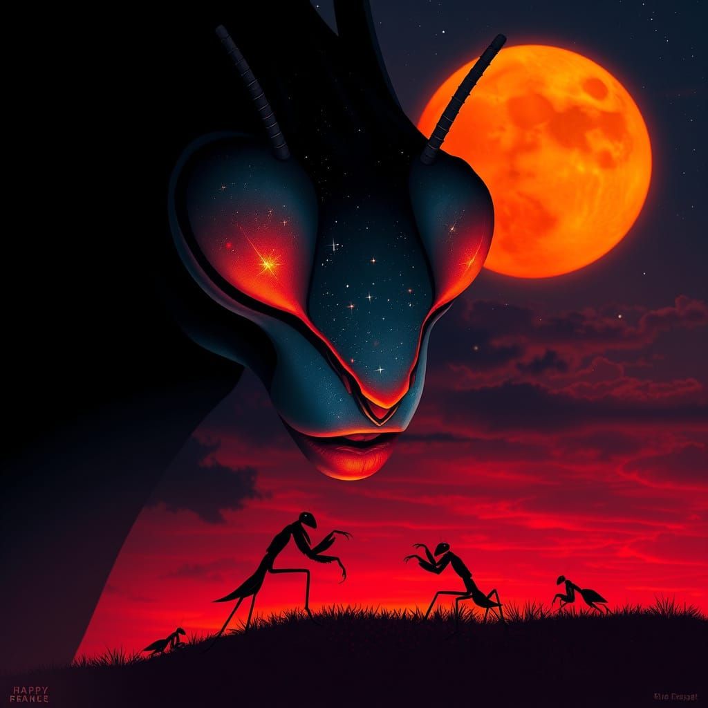This dreamlike image shows a mantis face against a vibrant night sky. Silhouetted mantises battle on a hillside under intense, fiery orange and star-lit colors.