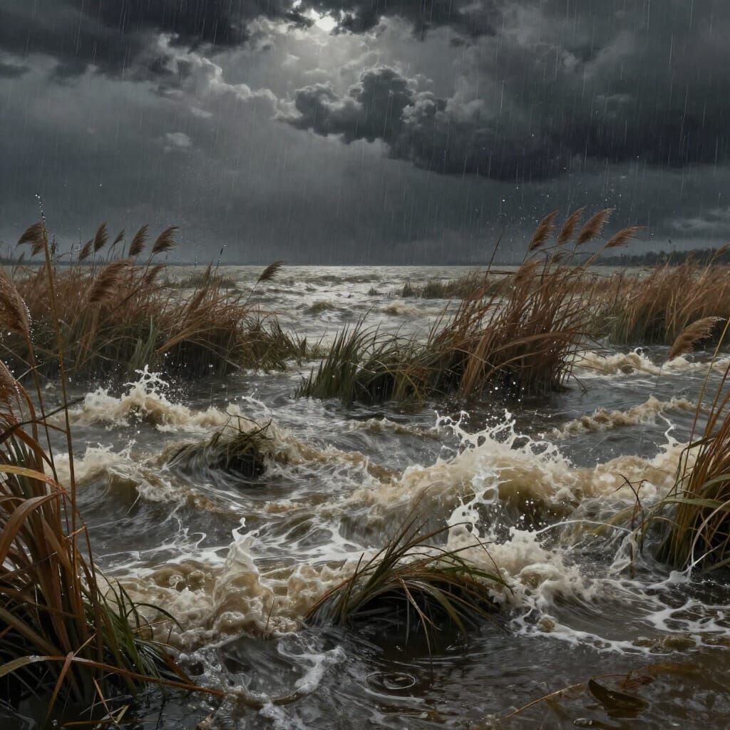 A detailed matte painting of a lake in a powerful storm, with wind-swept reeds and crashing waves. Rendered in deep, complementary colors with fantasy concept art style.