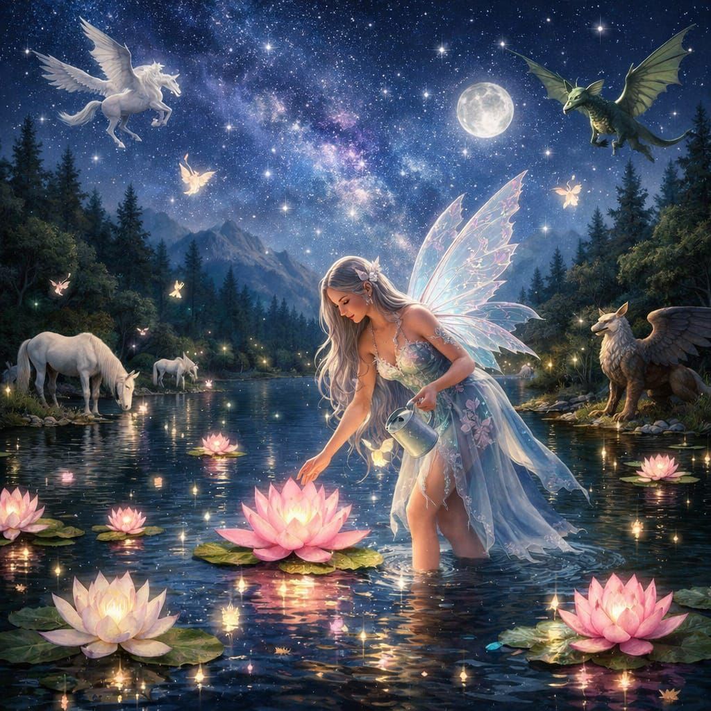 This image shows an ethereal fairy gracefully walking on a starry night lake, surrounded by magical lotuses and mythical creatures like unicorns and dragons flying overhead.