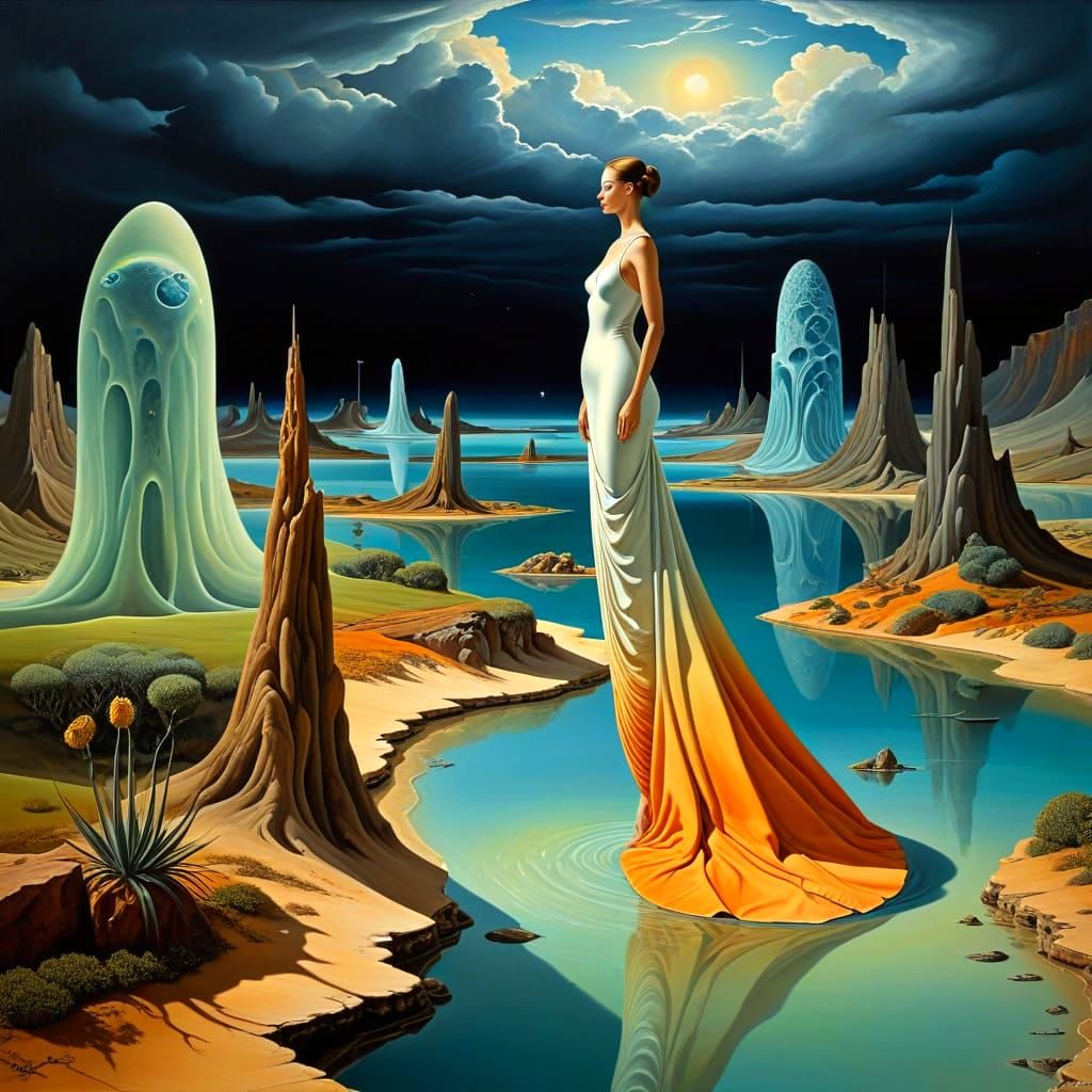 stunning fantastic surreal landscape in the style of Johfra Bosschart, Salvador Dali, Max Ernst, Andreas Lie, Catherine Hyde, Esao Andrews, Fabio Hurtado, Gertrude Abercrombie, Kay Sage, Georgia OโKeeffe, Remedios Varo, Leonor Fini, Meret Oppenheim; smooth, vivid vibrant colors, fantasy, surrealism, ...