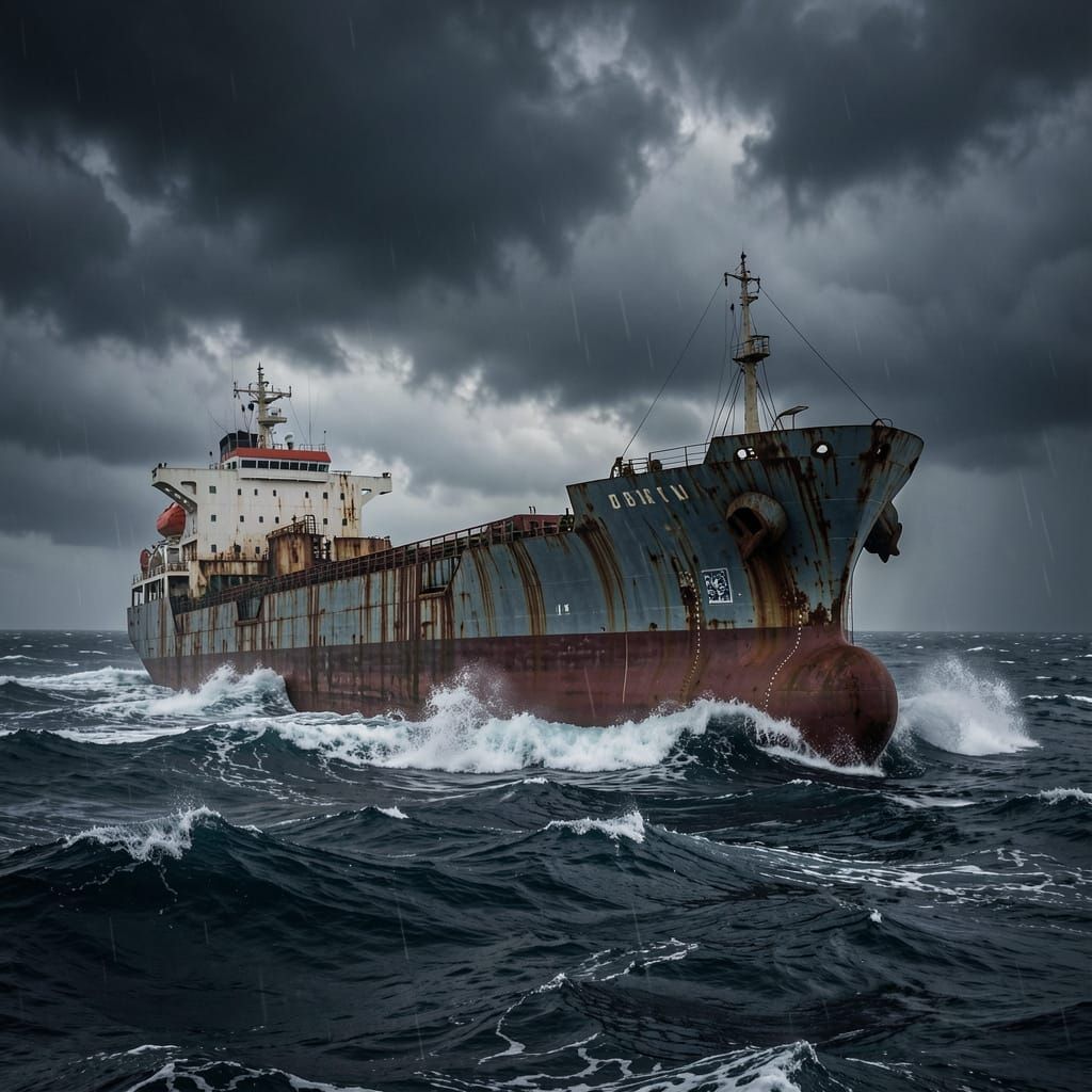 This hyperrealistic image shows a massive, decaying oil tanker battling colossal waves on a dark, stormy sea. Dramatic lighting and deep shadows enhance the sense of isolation and industrial melancholy.