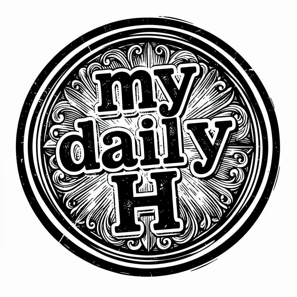 This image features a black and white tattoo design with bold, vintage stamp-style lettering spelling "my daily H". It's encircled by a double frame with intricate illustrative details, evoking woodcut aesthetics.